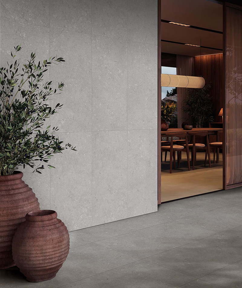 萊姆石 - 薄霧灰,靈感源自古羅馬萊姆石,運(yùn)用先進(jìn)噴墨技術(shù),將海洋生物沉淀的奇妙歷程融入磚體,再現(xiàn)天然石材的獨(dú)特質(zhì)感。